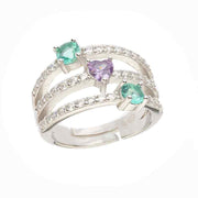 Anello trilogy in argento 925 rodiato con cristallo dal taglio a cuore e rotondi smeraldo/indicolite con pavè di zirconi clear. Misura regolabile. AN39682-AR48