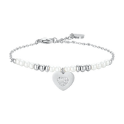 Bracciale Donna in acciaio ipoallergenico con perle bianche e sfere in acciaio con cuore con cristalli bianchi. Lunghezza: 16,5 + 3,5 cm. Misura cuore: 12 x 12 mm. Misura perle: 3,5 mm. BK2619